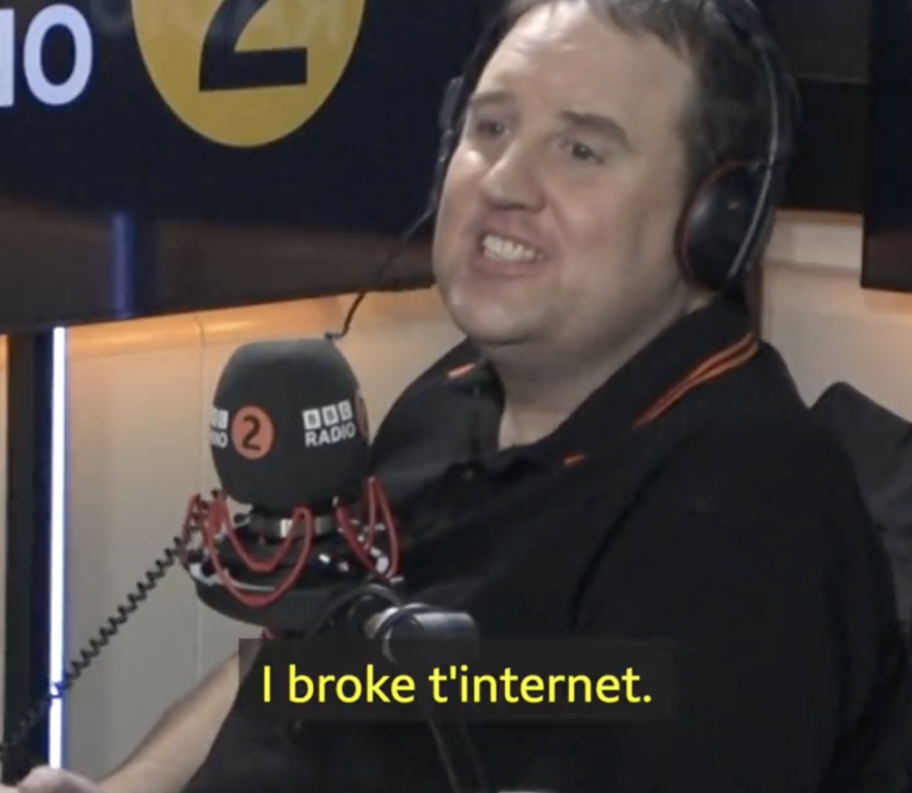 As he told Zoe Ball on BBC Radio 2 yesterday: “I broke t’internet!”